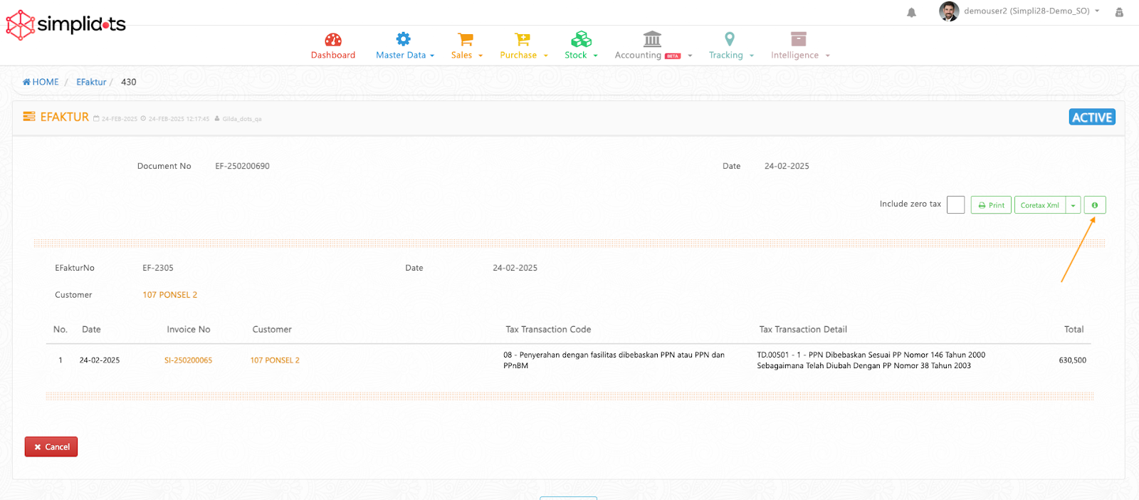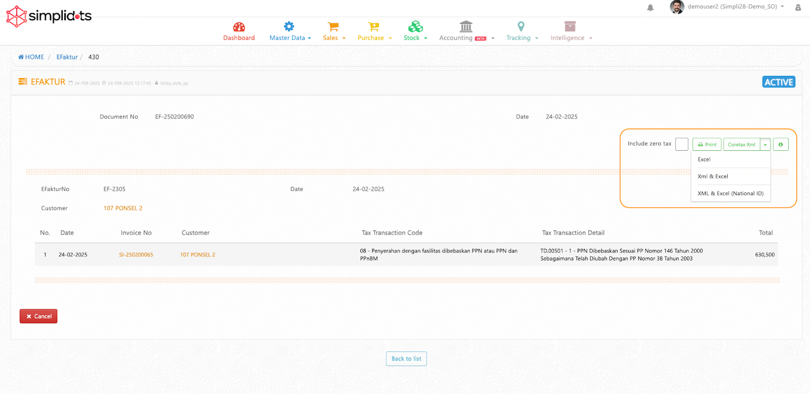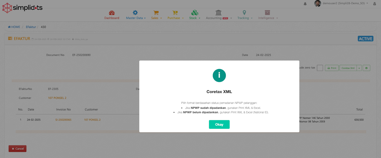 Sekarang, ditambahkan opsi baru di detail eFaktur: **XML & Excel (National ID)**. Fitur ini khusus untuk customer yang **belum melakukan pemadanan NIK–NPWP**, sehingga invoice mereka tetap bisa diimport ke Coretax.